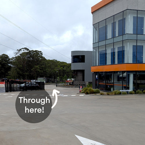 Continue straight along the driveway, PAST Storhub, through to the grey building behind.