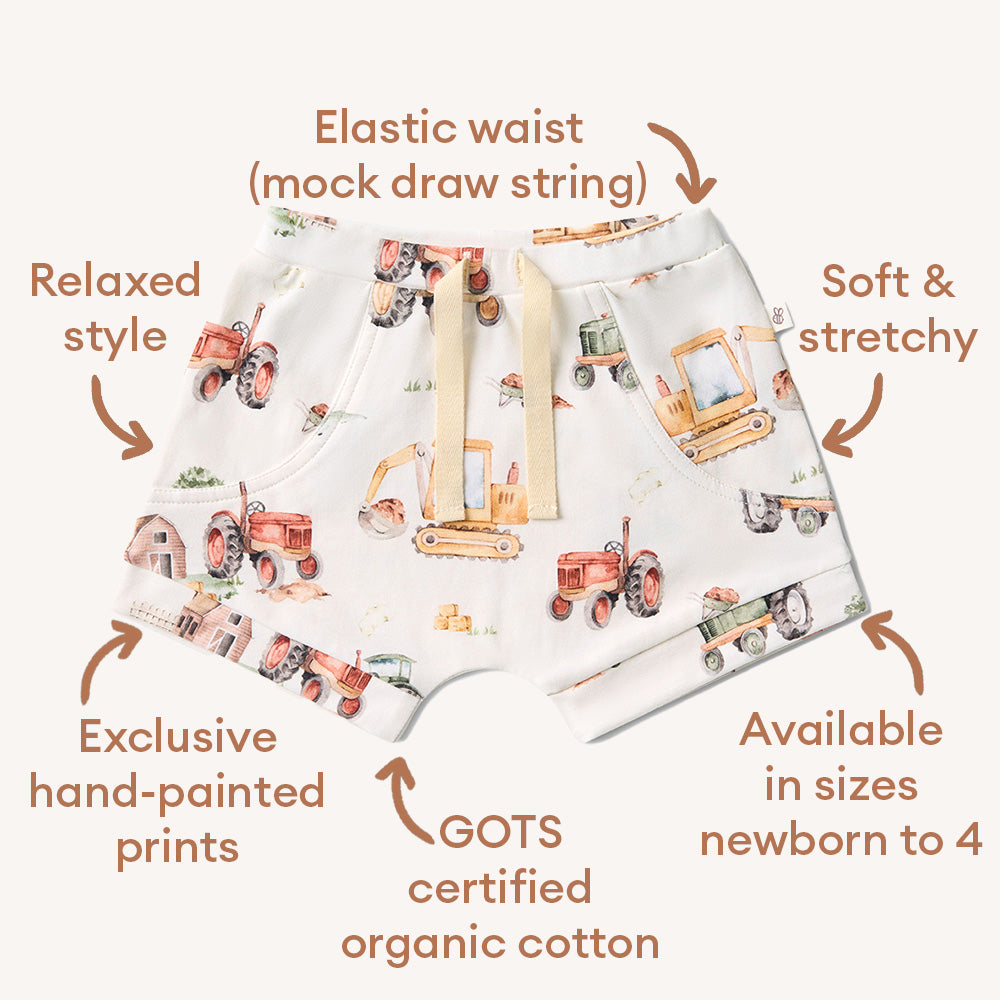 Snuggle Hunny organic Diggers & Tractors shorts are made for babies and toddlers. They are practical whilst being very stylish and match beautifully with our fitted bodysuits and T-Shirts.