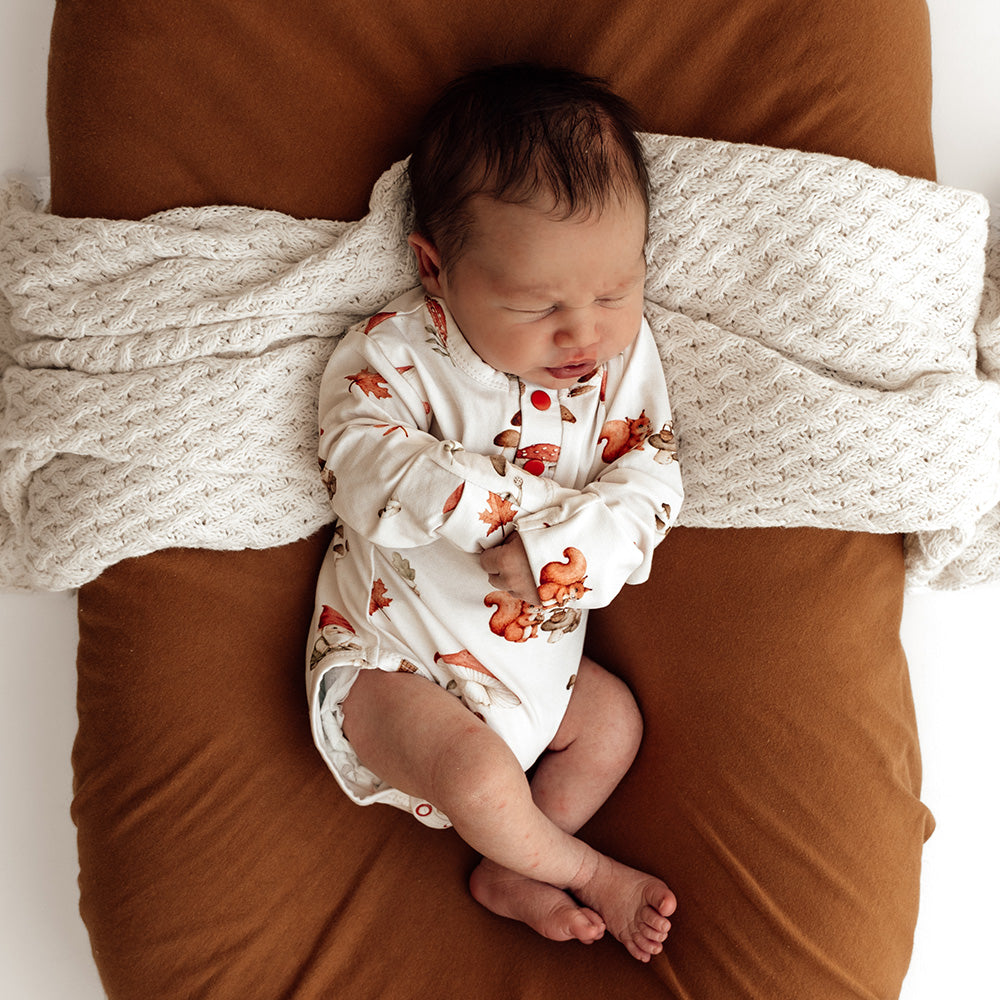 Snuggle Hunny organic bodysuits are made for babies and toddlers. This bodysuit is long-sleeved, and great for cooler days in Summer and Winter under layers. In our Gnomes print.