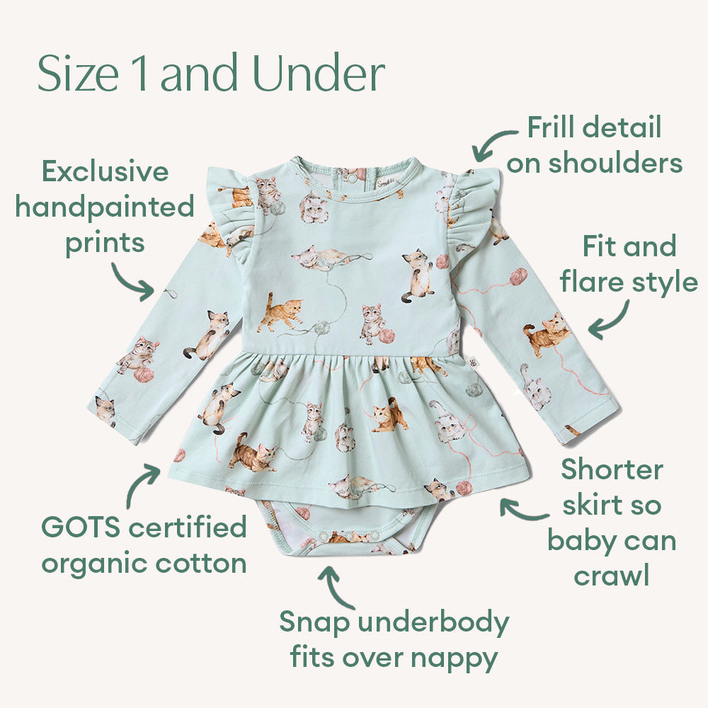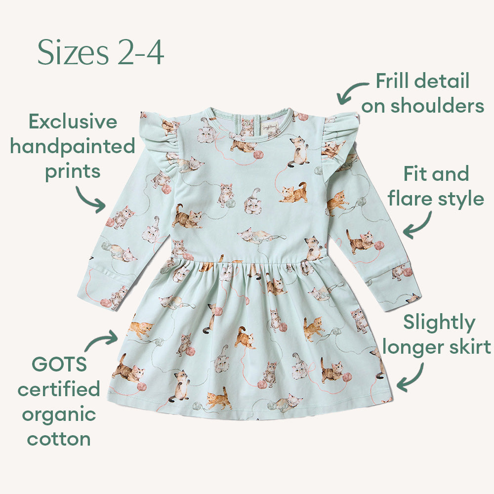 Our Snuggle Hunny Kittens dress is beautiful and made from certified organic cotton. It has long sleeves and is available in sizes from 0-3 months up to size 4.