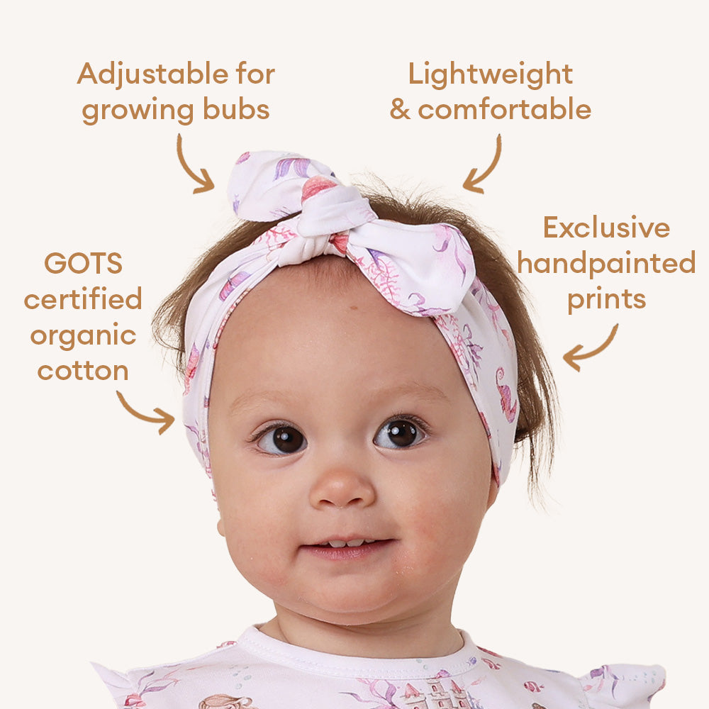 Our Snuggle Hunny organic cotton jersey topknot is soft and snuggly. This topknot features our Mermaid design and is made with Certified Organic cotton.