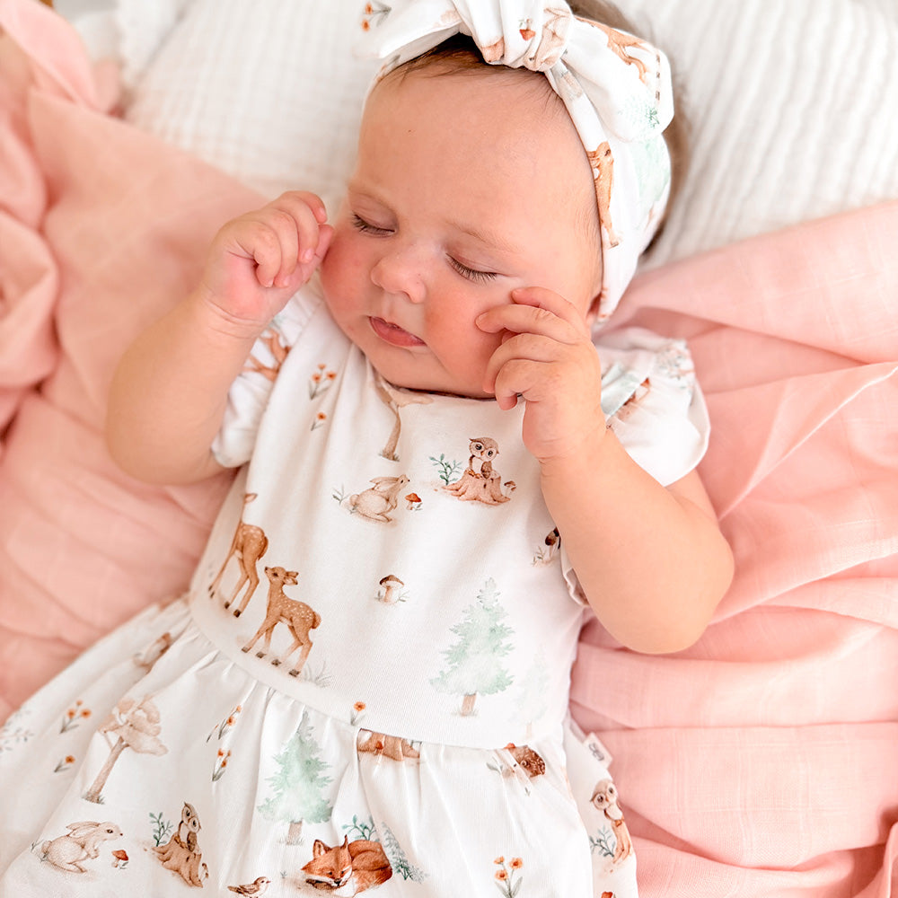 Soft and stretchy, our dresses are easy-care and very comfy for bub. The sizes up to and including size 1 come with a snap underbody to go over a nappy. Size 2 and up doesn't have the snap body feature. We have really focused on the details and ensured the dresses up to size 1 are short enough so that a baby can crawl and not trip over the skirt. Size 2 and over, when they're walking, is a bit longer.